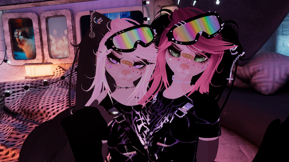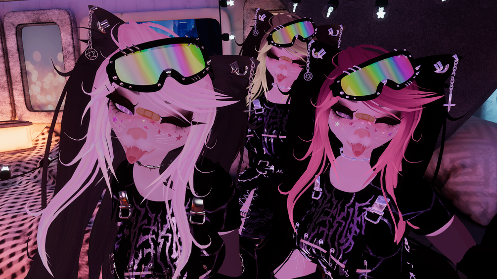 Head/Body: Zinpia & Bunisu (heavily edited by Maggotz & Snowie not for reuse!), Hair: Bunisu, Body Texture: Max and Snowie, Eye Texture: TERRI, UW Set: Zinpia, Dress: Vinuzhka, Goggles: Lunarai, Tail: Mokono, Ears: Boo, Barbwire Choker: teacakezz, Piercings: kri, Arm Warmers: sunnybun, Leg Warmers: Exodys, Spt: YudaJudaStore, Whiskers: Orca, Leg Ribbons: Hayami 3D, Torso bows: YamuVR, Av3 Creator: Rafa, Icons: 「awmi」, Matcaps: Sivka, Tattoo: miruu